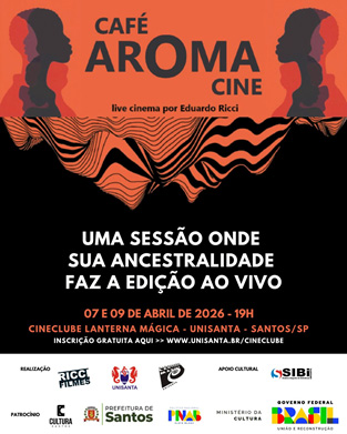 A estreia do Live Cinema “Café Aroma Cine” acontece nos dias 7 e 9 de abril, às 19h, na Sala Maurice Legeard de Cinema (Bloco E, 5º andar), na Unisanta, em Santos/SP, com entrada franca. Para participar, é necessário realizar inscrição gratuita pelo site www.unisanta.br/cineclube. As sessões contarão com múltiplas telas, transformando o ambiente em um cenário vivo de imagens, sons e sensações. Em tempo real, imagens editadas por Ricci, trilhas criadas pelo músico Jota Amaral e ambiências se entrelaçam para construir uma narrativa audiovisual que atravessa a história, a memória e os afetos da cidade.
