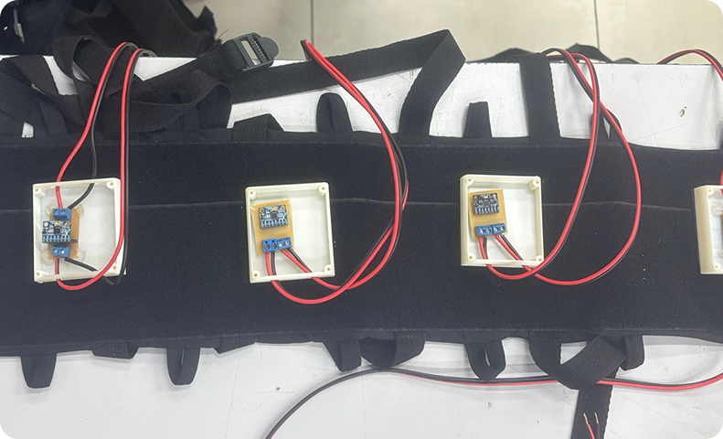 Colete para avaliar desvios posturais da coluna vertebral de forma não invasiva. Dados de inclinação são coletados e transmitidos para um software que gera relatórios visuais para fisioterapeutas.