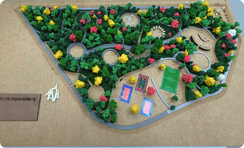 Parque da disciplina de Paisagismo, voltado à saúde e bem-estar da população, que conta com quadra poliesportiva, quadra de vôlei, área sensorial, praça principal, área cultural, entre outras atividades.