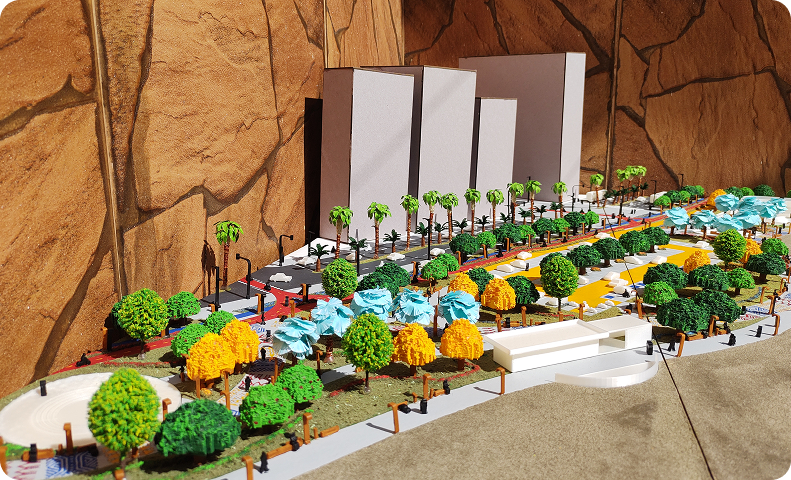 Maquete física elaborada na escala 1:200, composta por quatro painéis que juntos possuem 1,20 m x 0,80 m, garantindo riqueza de detalhes em cada um dos elementos.