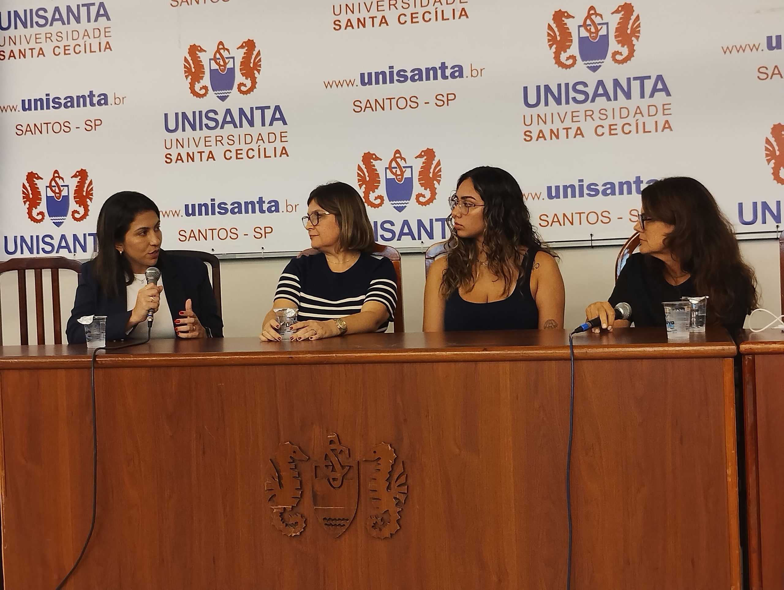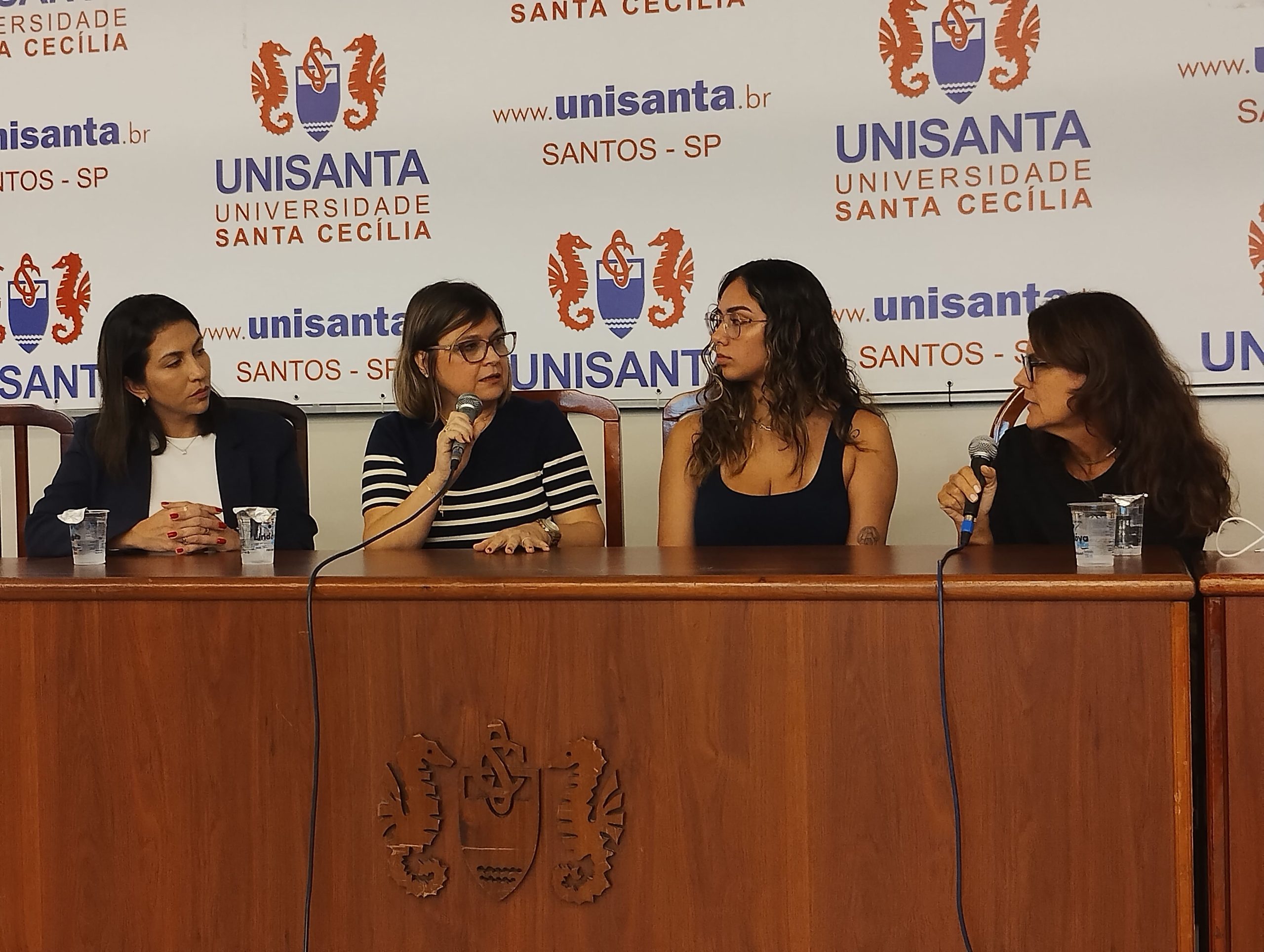 O Diretório Acadêmico William Tavares, da Faculdade de Artes e Comunicação (FaAC) da Universidade Santa Cecília (Unisanta), promoveu, em parceria com o projeto Chega! – Observatório Unisanta de Violência contra a Mulher, um bate-papo sobre violência contra mulheres. A atividade foi aberta aos estudantes dos quatro cursos de comunicação: Jornalismo, Publicidade e Propaganda, Design Gráfico e Marketing. O encontro aconteceu nesta quinta-feira (12), às 19h, no Auditório do Bloco E, no 4º andar do campus, e contou com a participação profissionais convidadas que atuam diretamente no enfrentamento da violência de gênero.