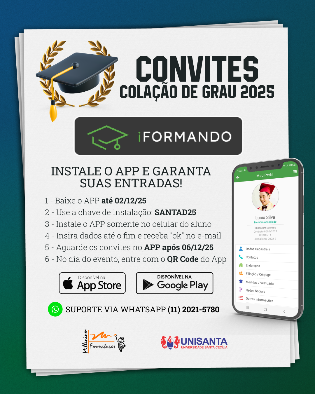 O APP está disponível no App Store e no Google Play. Se surgirem novas informações, elas serão publicadas em www.unisanta.br. Atendimento da Millenium Formaturas e suporte do APP iFormando via WhatsApp: (11) 2021-5780. Outras dúvidas pelo e-mail saf1@milleniumformaturas.com.br.