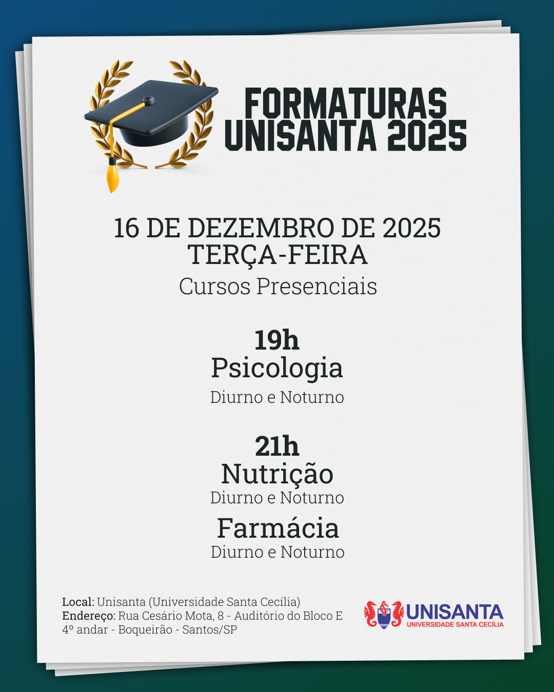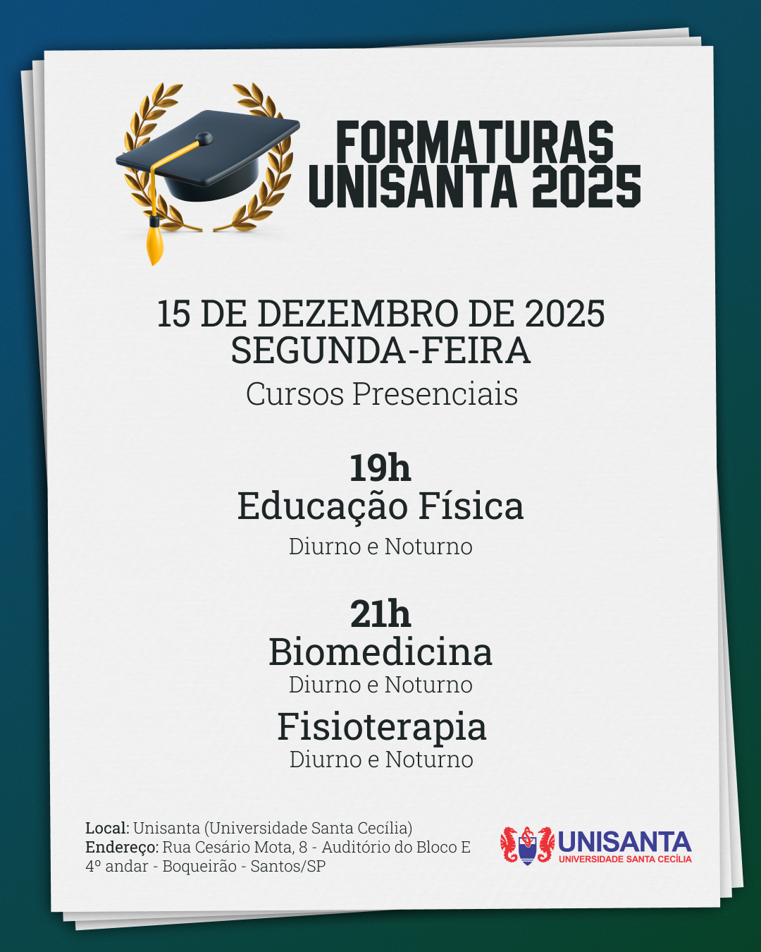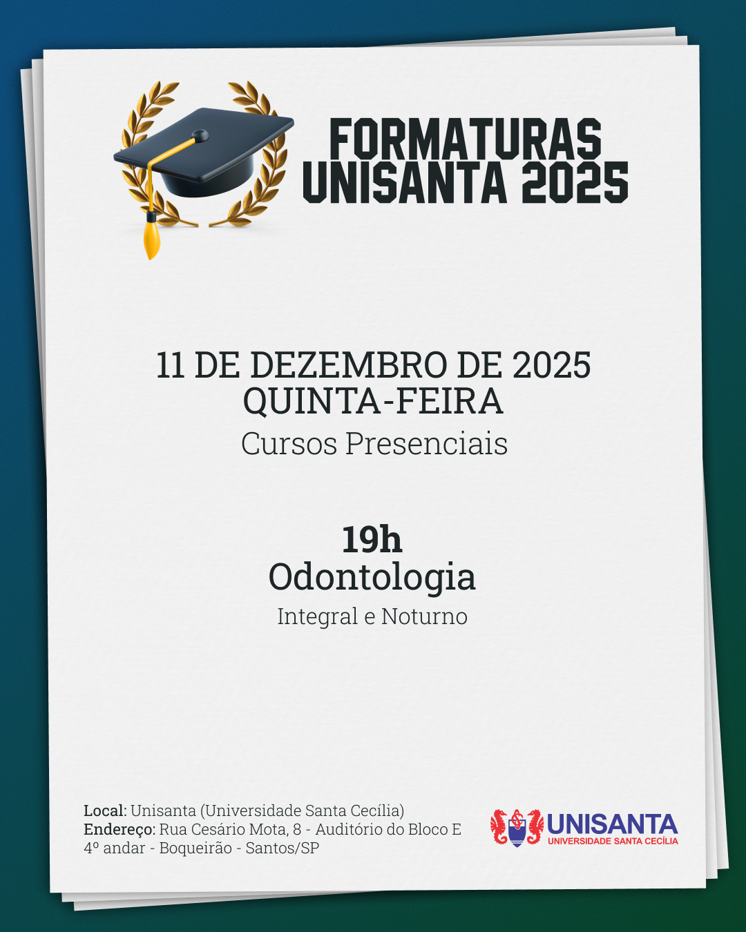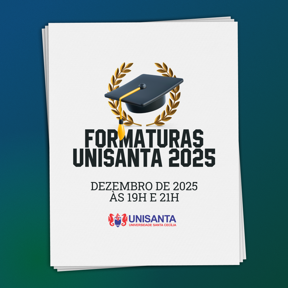O APLICATIVO iFORMANDO SERÁ A PLATAFORMA OFICIAL PARA EMISSÃO DE CONVITES E ACESSO À COLAÇÃO DE GRAU DENTRO DA UNISANTA. INSTALE O APP ATÉ 2 DE DEZEMBRO DE 2025 (OS CONVITES NÃO APARECEM DE IMEDIATO). APÓS 6 DE DEZEMBRO, AGUARDE A DISPONIBILIDADE DOS CONVITES DE FORMA GRADATIVA POR CURSO, DATA E HORÁRIO DENTRO DO PRÓPRIO APP. TODOS OS FORMANDOS CONSEGUIRÃO VISUALIZAR SEUS CONVITES PARA TER ACESSO DE FORMA SEGURA AO EVENTO. AGUARDE TRANQUILAMENTE!