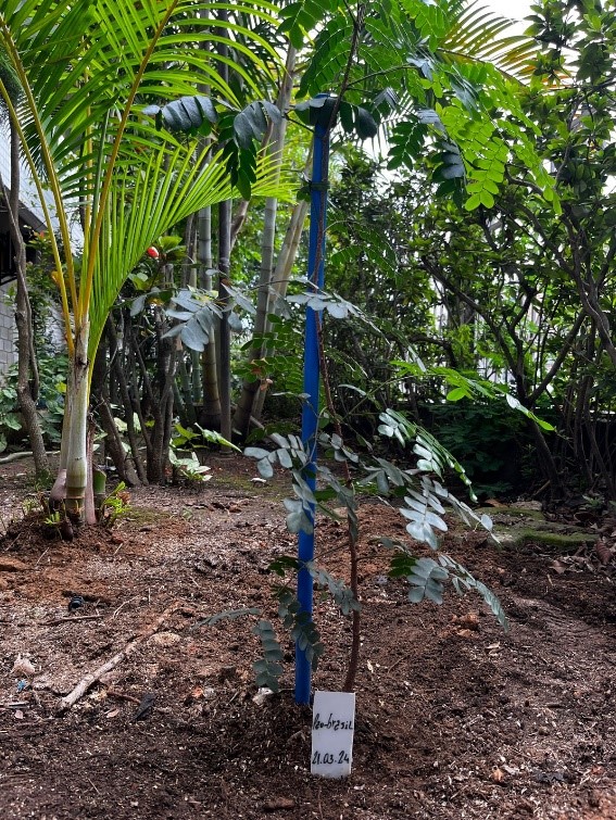 Antes do plantio definitivo, a muda permaneceu sob os cuidados da equipe na estufa do Bloco B, onde recebeu acompanhamento até atingir o porte adequado para o cultivo em área aberta. O profissional da Eco Tree realizou a abertura do solo, e a equipe finalizou o processo com o posicionamento da muda, o fechamento da cova e a rega inicial.