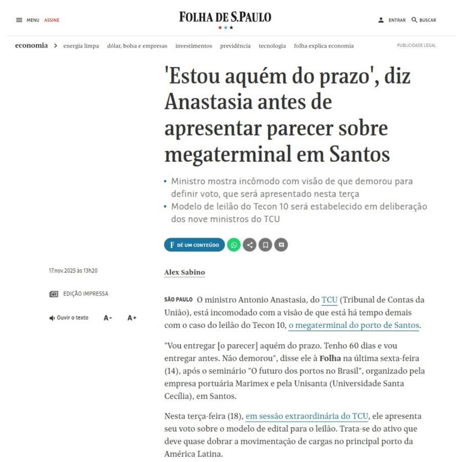 O seminário “O futuro dos portos no Brasil”, organizado pelo Programa de Pós-Graduação e Mestrado em Direito Portuário e Marítimo da Universidade Santa Cecília – Unisanta e pela empresa portuária Marimex, foi citado em matéria do jornal Folha de S.Paulo.