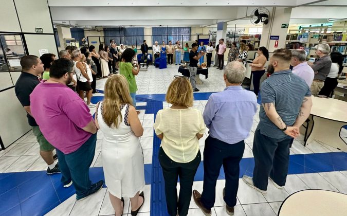 A Universidade Santa Cecília – Unisanta realizou, na segunda-feira (30/3), uma homenagem à coordenadora do Sistema Integrado de Bibliotecas (SiBi), Ana Maria Racciopi Silveira (in memoriam). Na ocasião, estiveram presentes seu esposo, Geraldo Menezes, e sua nora, Mariana Ferreira Maia, a Direção Superior da instituição, além de amigos e antigos colaboradores que conviveram com Ana Maria.