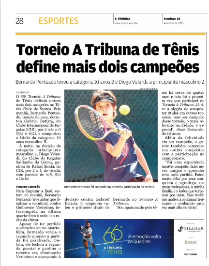 Bernardo foi destaque da edição do dia 28 de setembro do Jornal A Tribuna. Na matéria, o estudante ressalta que foi uma experiência incrível competir, fazer novos amigos e aprender com cada partida. “Estou muito feliz por essa conquista e agradeço aos meus treinadores, à minha família e a todos que torceram por mim. Esse troféu me motiva a continuar treinando e sonhando cada vez mais alto no tênis”.