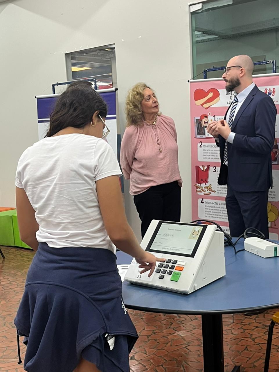 Durante a atividade, os estudantes puderam votar em candidatos fictícios para deputado federal e estadual, dois senadores, governador e presidente. “Preparamos uma votação de forma lúdica, para que os alunos possam entender todo o processo eleitoral. Isso vai fomentando o eleitor mais jovem a ter um primeiro contato com a Justiça Eleitoral e com uma urna”, destacou Frederico Borges Affonso.