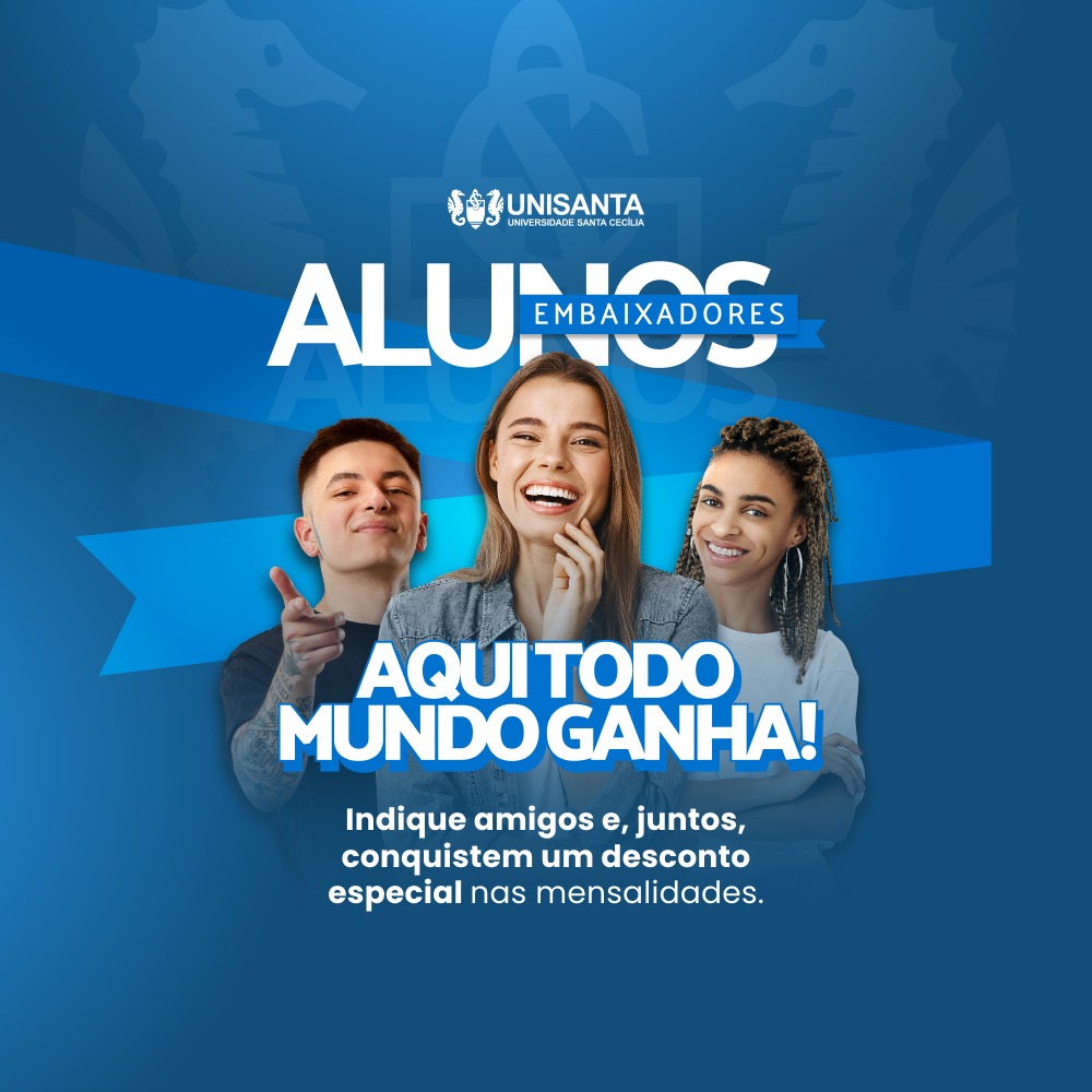 Por meio da campanha Indica Amigo – Alunos Embaixadores Unisanta, cada indicação que se tornar uma matrícula efetiva em um dos cursos de graduação presencial, dentro do prazo de validade da campanha, garantirá descontos na mensalidade ao indicado e indicador dos cursos presenciais e EAD, conforme regulamento.