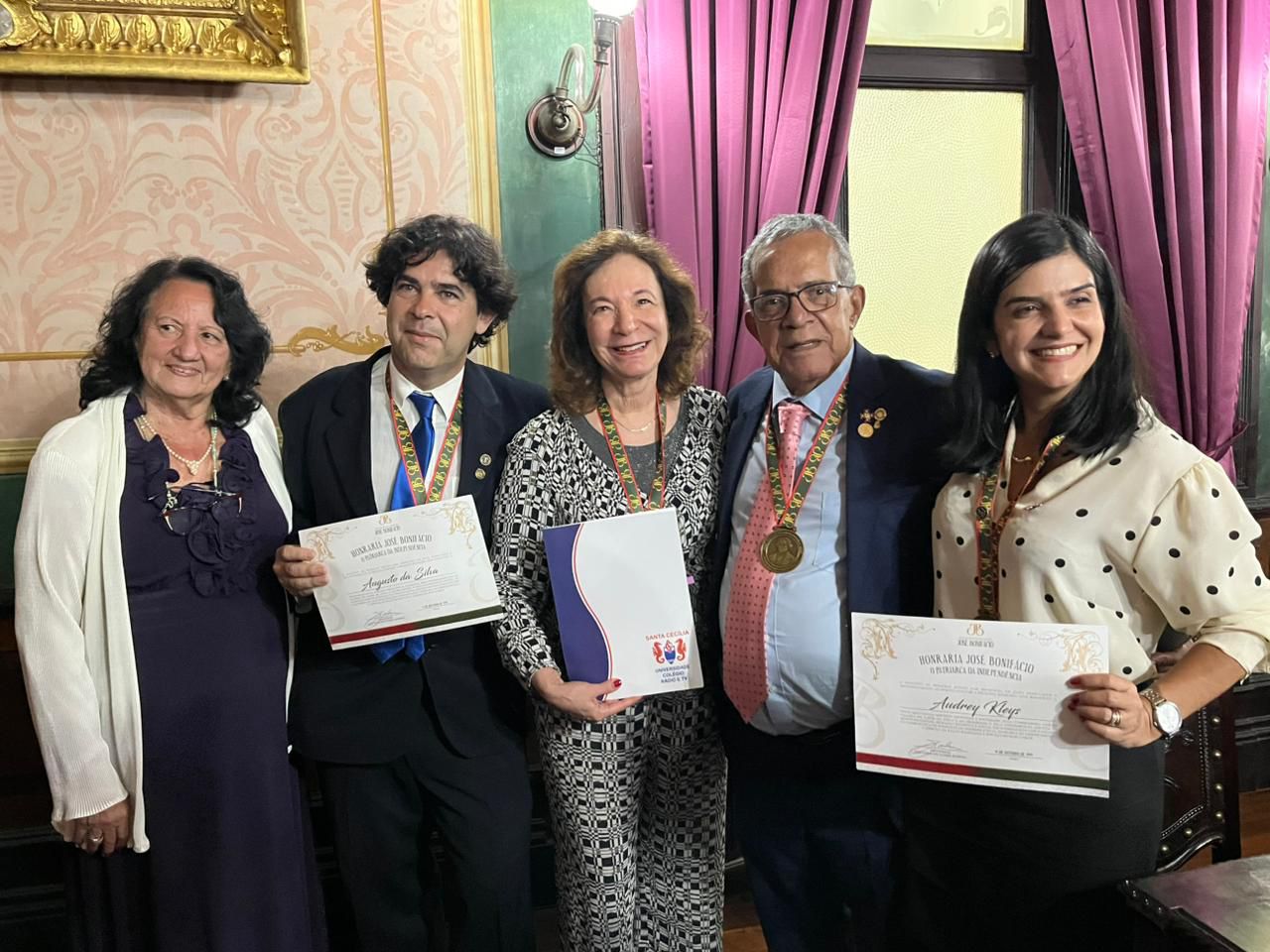 Homenagem – Na ocasião, a Direção Superior da Unisanta – Dra. Sílvia Teixeira, Dra. Lúcia Teixeira e Dr. Marcelo Teixeira – foi homenageada pelo Instituto com a honraria “José Bonifácio”, pelos relevantes serviços prestados à sociedade e pelo compromisso com os valores do saber, da ética e do progresso.