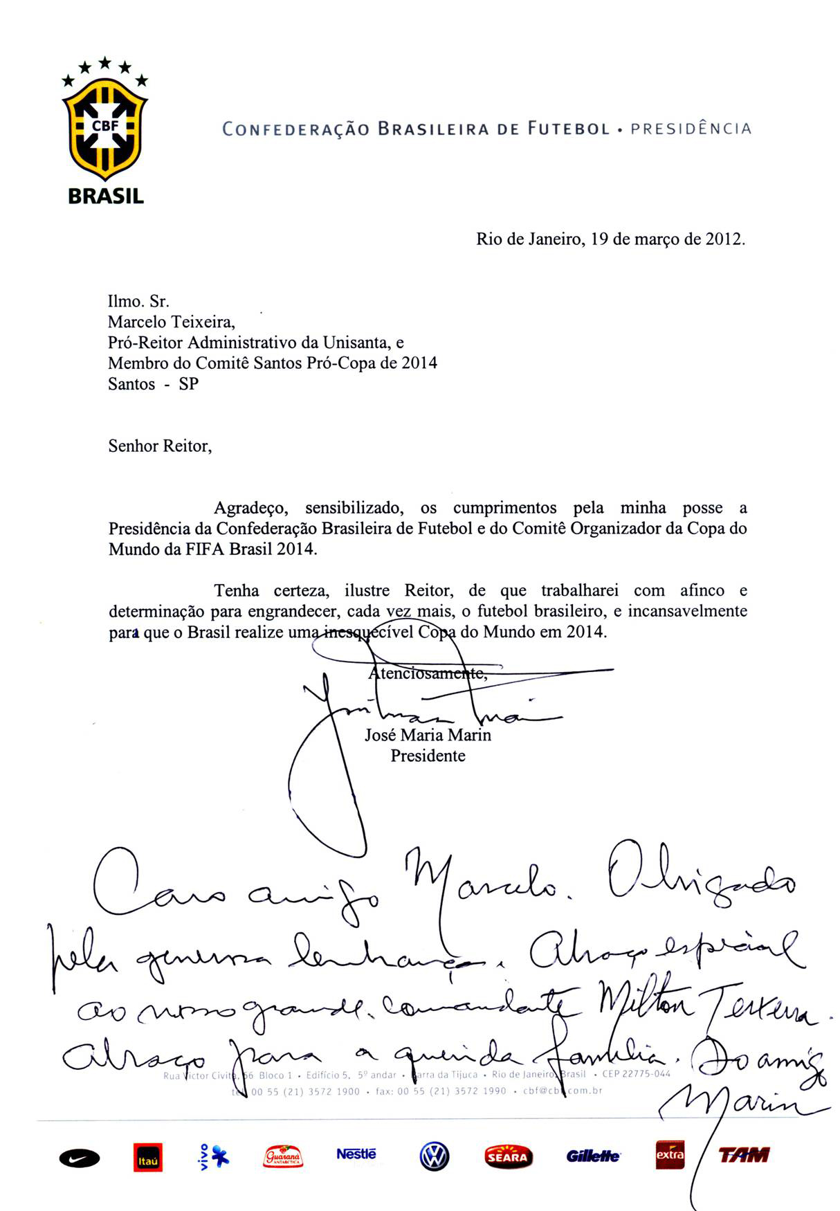 Presidente da Confederação Brasileira de Futebol (CBF) e do Comitê Organizador Local da Copa do Mundo de 2014 (COL), o ex-governador de São Paulo, José Maria Marin, encaminhou ofício ao Pró-reitor Administrativo da Universidade Santa Cecília (UNISANTA), Marcelo Teixeira, em agradecimento aos votos de sucesso enviados pela alta direção da instituição de ensino, quando da posse de Marin nas duas entidades, em 12 de março.