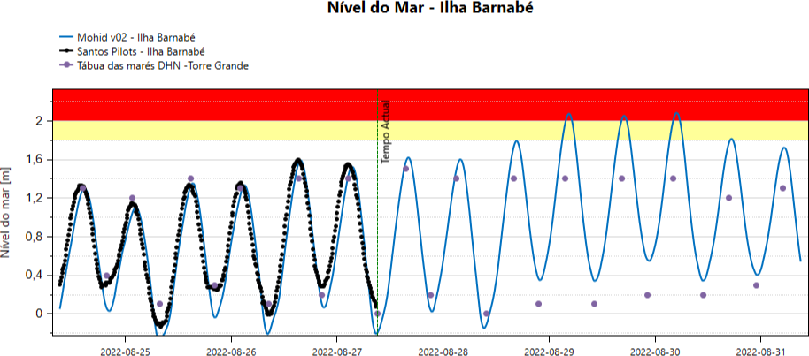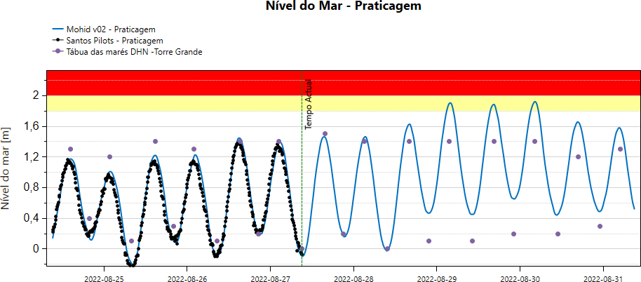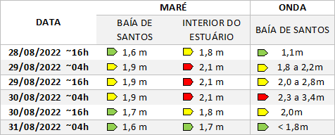 Com relação ao nível do mar, a maré poderá ultrapassar 1,9m na Baía de Santos e 2,1m no interior do estuário, com picos na segunda-feira, às 4 horas e 16 horas, e na terça-feira às 4 horas, representando aumento de até 70cm em relação à tábua de marés (Tabela 1, Figuras 3 e 4).