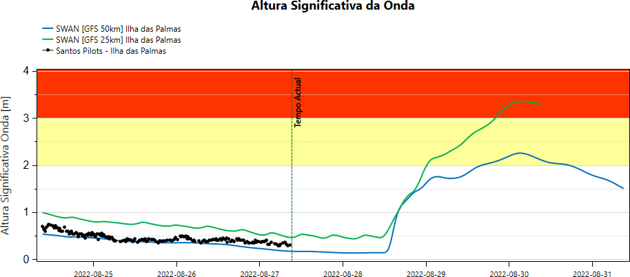 O mar ficará bastante agitado na região da Baía de Santos, com ondas do quadrante sul-sudoeste variando de 2,0m a 3,4m de altura significativa entre segunda-feira (29/8) e terça-feira (30/8) (Figuras 1 e 2).