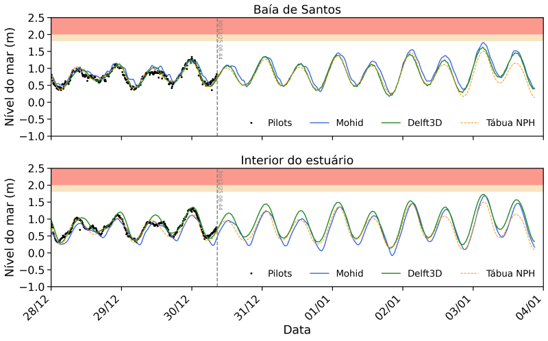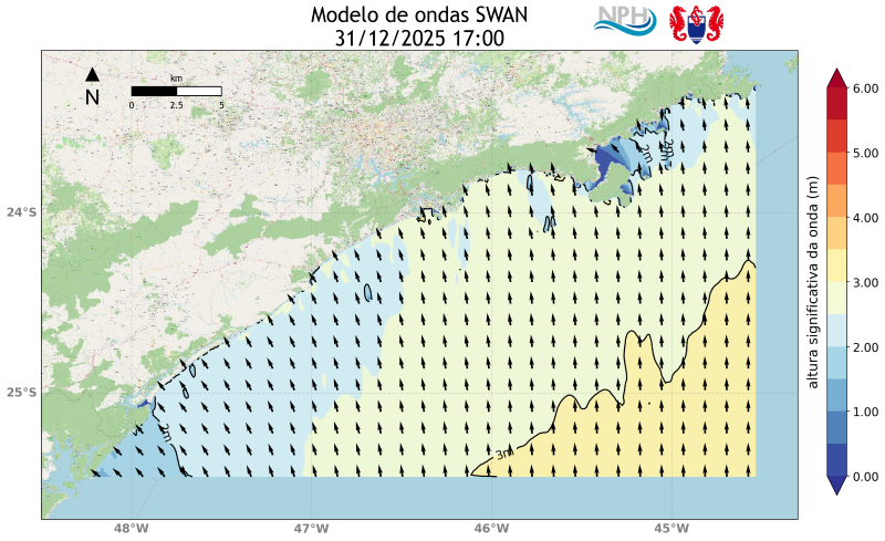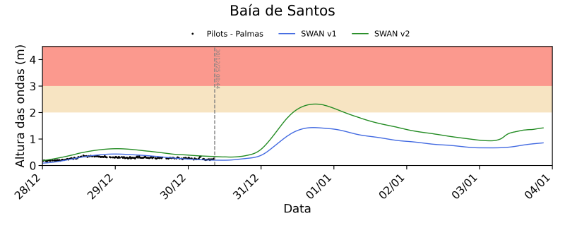 De acordo com as previsões dos modelos numéricos do Núcleo de Pesquisas Hidrodinâmicas da Unisanta (NPH-Unisanta), a Sala de Situação da Baixada Santista informa que o mar deverá ficar agitado na Baía de Santos e na orla das demais cidades da Baixada Santista entre terça-feira (30/12) e quinta-feira (01/01), incluindo o período de reveillon, com ondas de sul-sudeste que podem ultrapassar 2,0m de altura significativa na quarta-feira (31/12) (Tabela 1, Figuras 1 e 2).