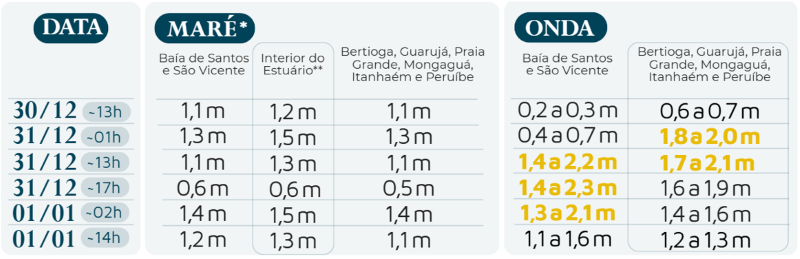 Com relação ao nível do mar, a maré poderá alcançar 1,4m em toda a região de orla da Baixada Santista e 1,5m no interior do Estuário (Santos, São Vicente e Cubatão), com altura máxima prevista para quinta-feira (01/01) às 02h, o que representa um aumento de até 20cm em relação à tábua de marés (Tabela 1, Figura 3).