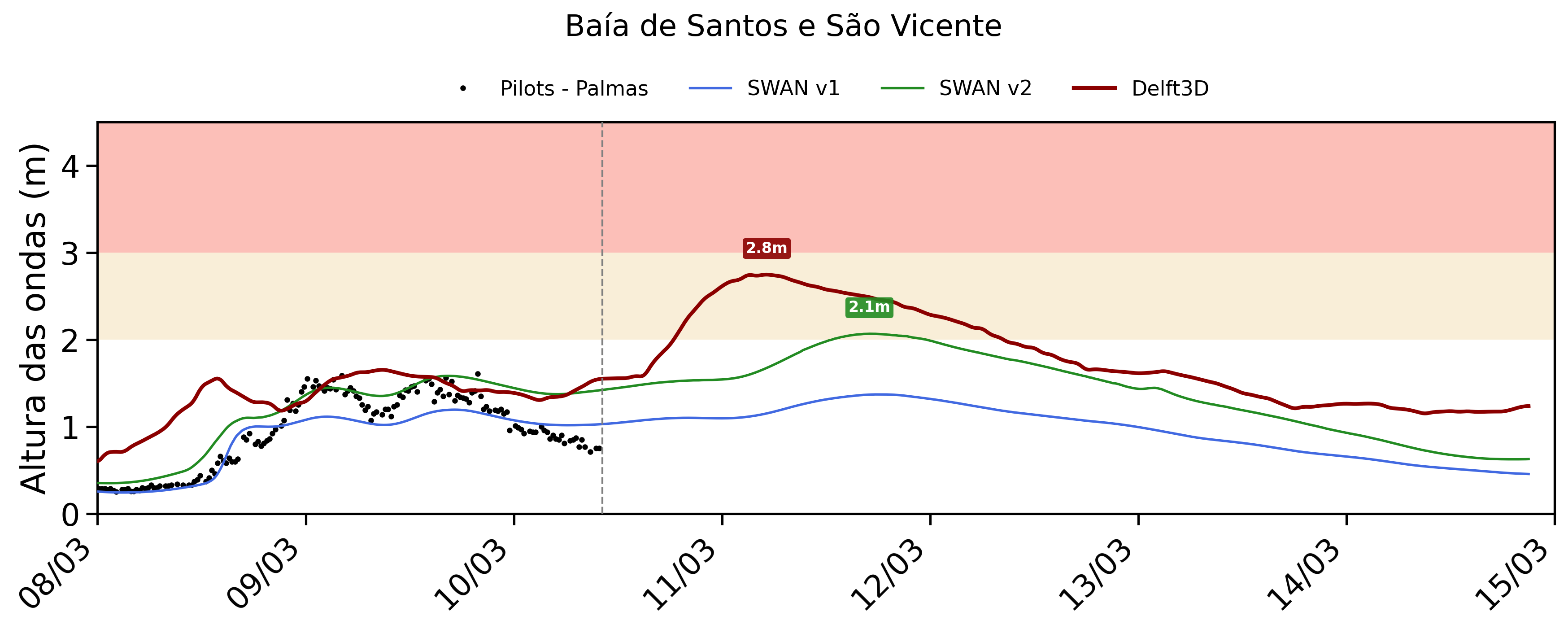 Figura 2. Previsão dos modelos de ondas. Altura significativa da onda (m) para a Baia de Santos (SWAN v01 em azul, SWAN v02 em verde e Delft3D em vinho). Dados medidos pelos sensores da Praticagem de São Paulo em preto. Os níveis de atenção e alerta, com base no Plano Municipal de Contingência para Ressacas e Inundações de Santos, estão em amarelo e vermelho, respectivamente.