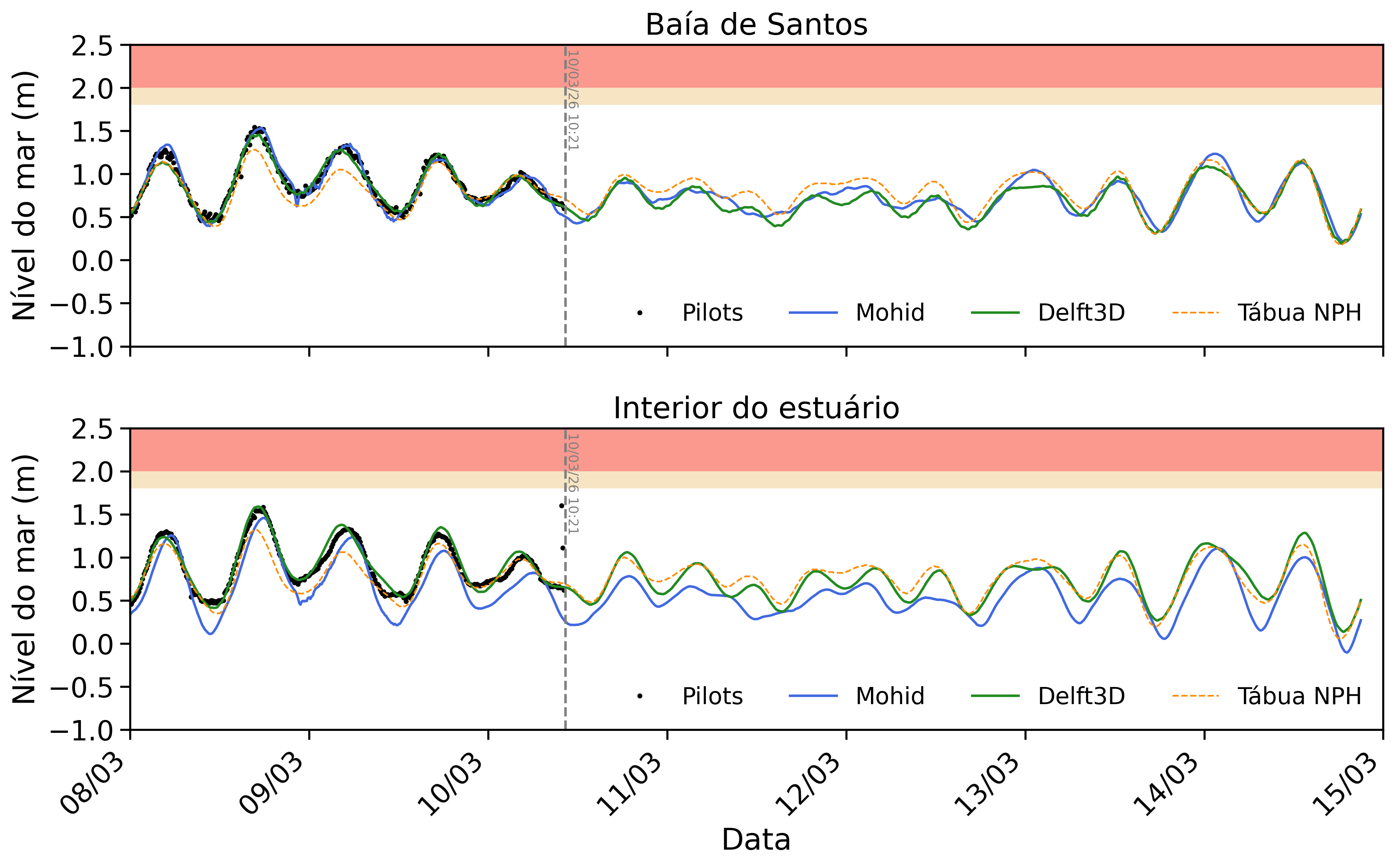 Figura 1. Previsão dos Modelos Hidrodinâmicos (Mohid, em azul e Delft3D, em verde), apresentando o nível do mar para as estações Praticagem (Baía de Santos, quadro superior) e Barnabé (Interior do estuário, quadro inferior). Dados medidos pelos marégrafos da Praticagem de São Paulo em linha preta e a previsão da tábua de marés em linha laranja tracejada. Os níveis de atenção e alerta, com base no Plano Municipal de Contingência para Ressacas e Inundações de Santos, estão em amarelo e vermelho, respectivamente.