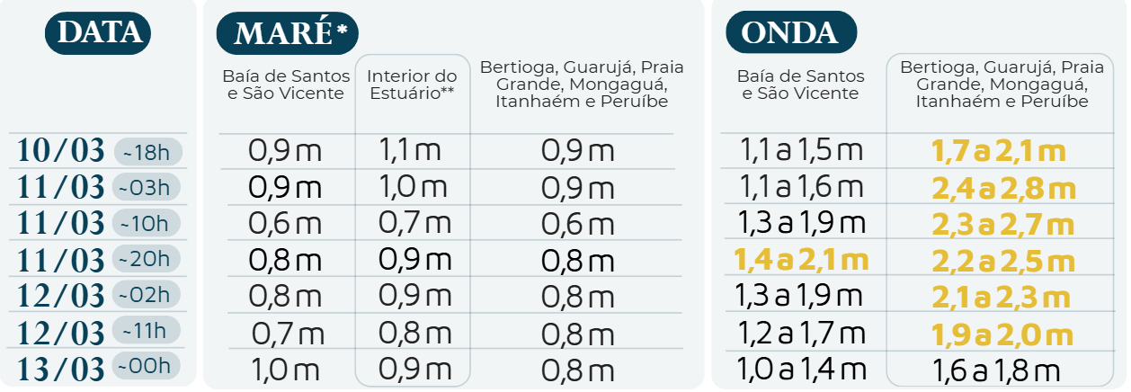 Boletim emitido às 10h30 de terça-feira (10/03/2026), com base no sistema IARA-BS/SACI-BS da Sala de Situação da Baixada Santista e no sistema AquaSafe Santos. Este é apenas um boletim informativo, a utilização da informação nele contida é de inteira responsabilidade do usuário. Informações oficiais sobre as condições de mar são emitidas pela Marinha do Brasil.
