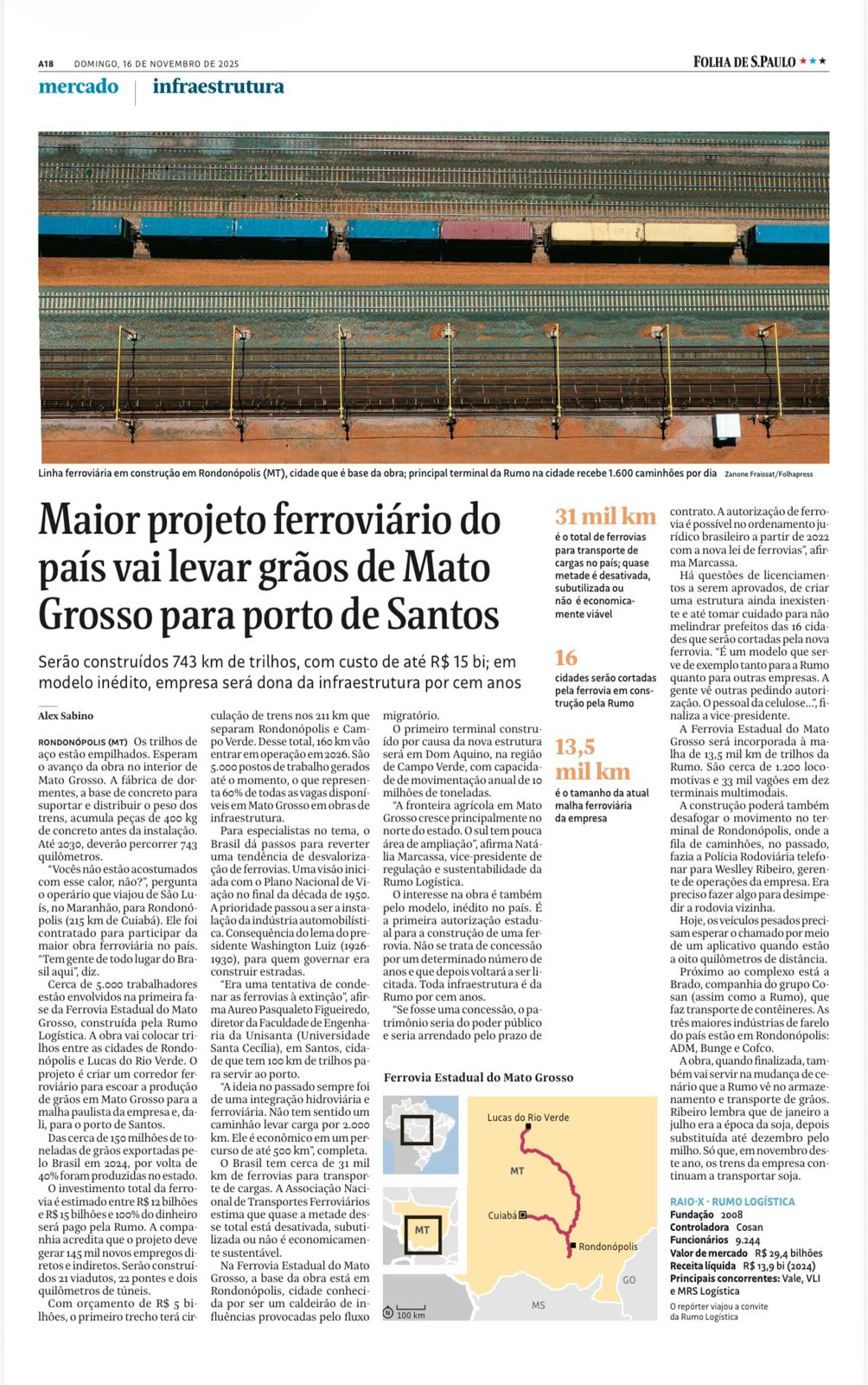 De acordo com o jornal, o projeto em questão visa à construção de um corredor ferroviário para escoar a produção de grãos de Mato Grosso até a malha paulista da empresa Rumo Logística e, de lá, para o Porto de Santos. Serão construídos 743 km de trilhos, com custo estimado de até R$ 15 bi.