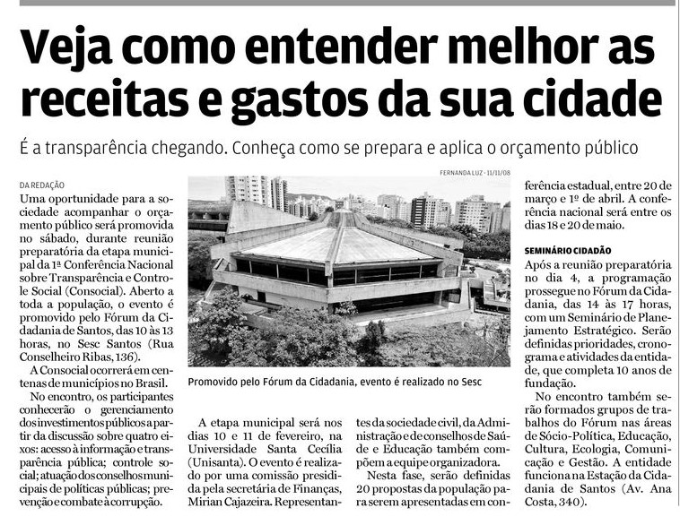 Em matéria do jornal A Tribuna, no dia 2/2, a Universidade Santa Cecília (Unisanta) foi citada como a sede da etapa municipal da Conferência sobre Transparência e Controle Social (Consocial). O evento é uma oportunidade para a sociedade acompanhar o orçamento público, suas receitas e os gastos com a sociedade. A etapa municipal, na Unisanta, será nos dias 10 e 11 de fevereiro. Nesta fase, serão definidas 20 propostas da população para serem apresentadas em conferência estadual, e posteriormente na etapa nacional.