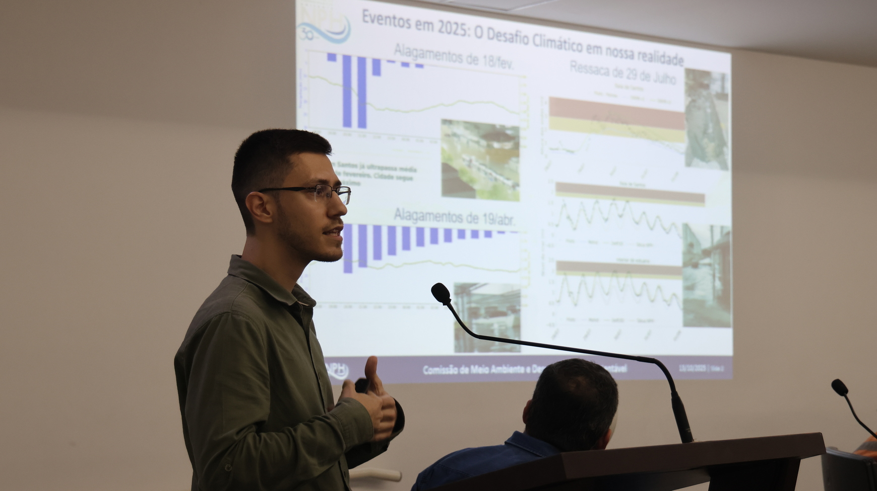 No dia 13 de outubro, o engenheiro Matheus Souza Ruiz, pesquisador do Núcleo de Pesquisas Hidrodinâmicas da Universidade Santa Cecília (NPH – Unisanta), participou de audiência pública sobre Desafio Climático e Estratégias para a Sustentabilidade Urbana em Santos, realizada pela Comissão de Meio Ambiente e Desenvolvimento Sustentável (CMADS).