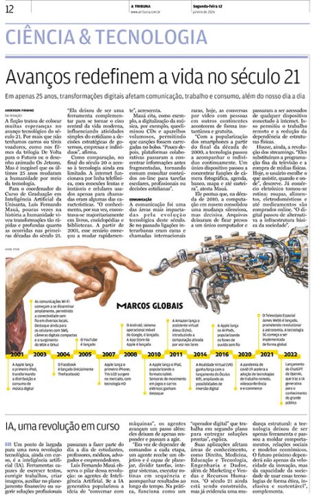 Na reportagem Avanços redefinem a vida no século 21, o professor analisa os impactos das transformações digitais no cotidiano da sociedade, abordando temas como tecnologia, comunicação, mercado de trabalho e consumo. Segundo Mauá, o avanço acelerado da inovação tecnológica, especialmente da inteligência artificial, tem provocado mudanças profundas na forma como as pessoas vivem, trabalham e se relacionam.