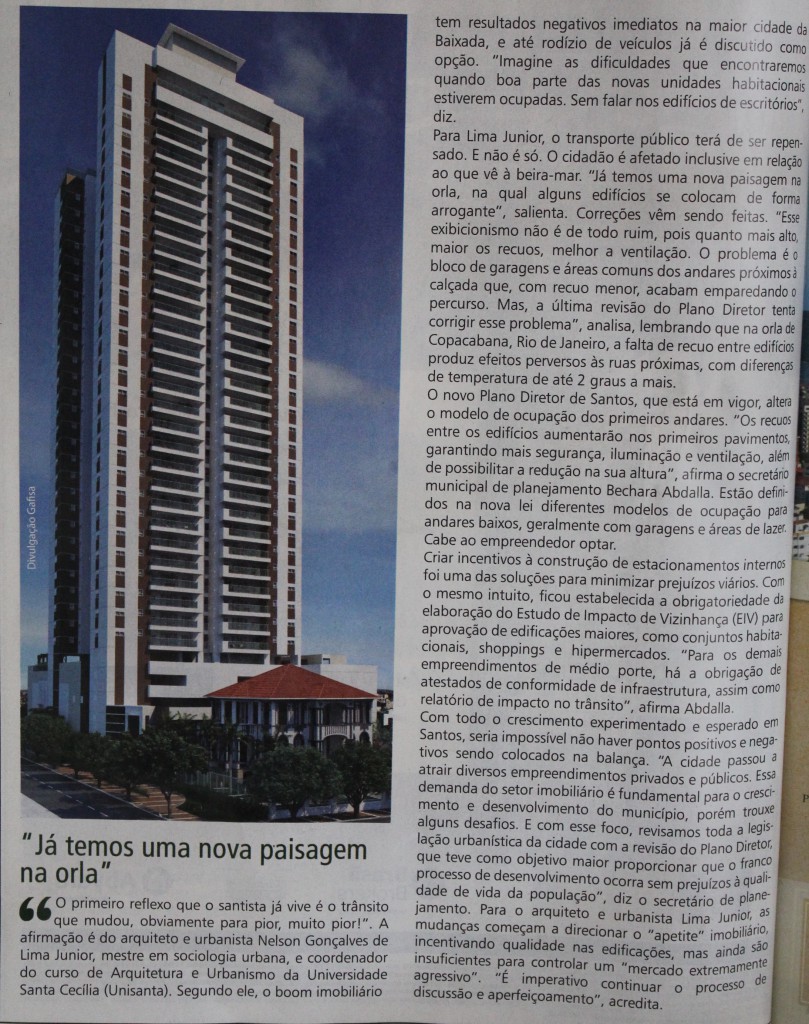 A matéria é sobre o chamado “boom imobiliário” em Santos, onde cada vez mais prédios são construídos e pessoas mudam-se para cá. Na entrevista, o professor fala sobre a situação atual do trânsito na cidade, e que tende aumentar nos próximos anos.