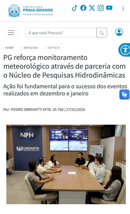 O Núcleo de Pesquisas Hidrodinâmicas da Universidade Santa Cecília (NPH – Unisanta) firmou parceria com a Prefeitura de Praia Grande para reforçar o monitoramento meteorológico do município. A ação foi destaque em matéria no site da Prefeitura, que enfatizou a importância dos trabalhos realizados para o sucesso dos eventos que ocorreram nos meses de dezembro e janeiro na cidade.